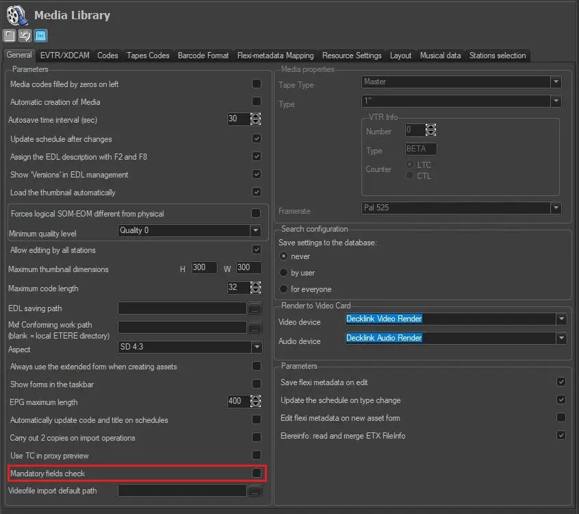The "mandatory metadata" feature needs to be activated by enabling the "Mandatory fields check" option under the "Etere Conf. > Settings > Media Library > General" section: