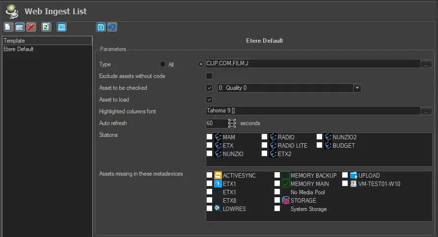 The Web List Ingest section allows for the creation of templates for the management and visualisation of the assets which have been scheduled to go on-air but which are still not yet ingested (i.e. not linked to any "playable" media file); this is from the EtereWeb > Ingest List section.