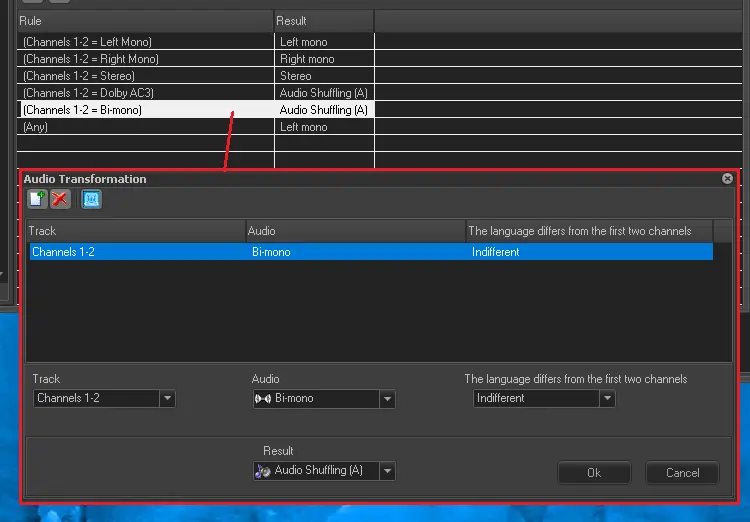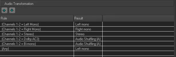 In the "Audio transformation" area, it is possible to delete, modify, and add the "transformation rules". Rules set here allow to indicate the audio format (or audio shuffling) to be used for replacing (into the schedule) the one set for assets. This feature allows, for instance, to replace the mono audio tracks of scheduled assets using a stereo format.