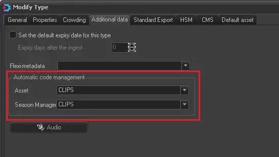 2. Then, Code Layouts need to be assigned on each asset type (e.g. clips, trailers, spots, etc.) for which the automatic code generation is intended to be used under the "Etere Configuration > Settings > Types > Additional data > Automatic code management" section: