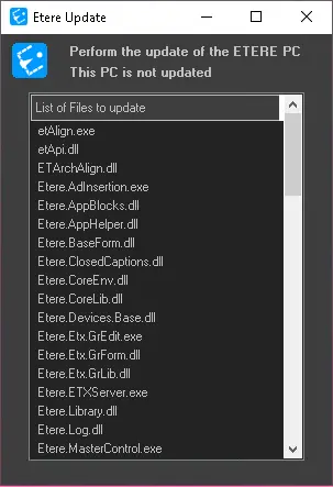Etere has provided services to check for updates daily (by default) automatically; each time the services find available updates on the network, the "Etere Update" application would be launched to notify the user.
