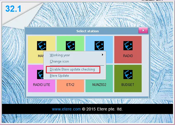 To disable the automatic daily check, launch the Etere Configuration module and right-click on the 'select station' window and select the 'Disable Etere update checking' to disable the services.