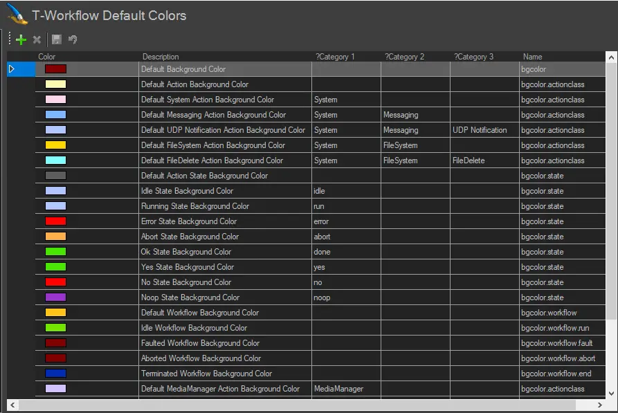 Before creating T-workflows, you can configure the T-workflow's colour palette under the Default Colours section to your liking. By associating a particular colour to all actions that fall in a specific category or for all events currently 'running' assigns a particular colour, overall T-workflow management is significantly facilitated.