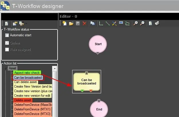 Action blocks are displayed as small boxes coloured according to their assigned colours. These blocks have a unique input but could have one or more outputs. Action blocks are ready to use just by dragging and dropping from the "Action List" in the "Editor "section in the T-Workflow.