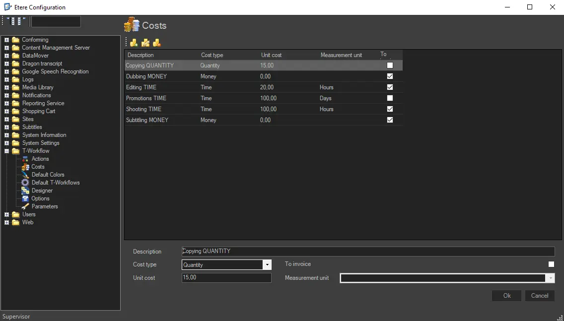 The Costs section allows to perform the first step of the Work Orders Management process; this step consists of defining a suited cost structure based on user-defined cost templates that will be used by worksheet actions (during both their creation and compilation). Using predefined costs provides added convenience to operators, allowing them to quickly create standard work orders by selecting the cost template to apply to the work order.