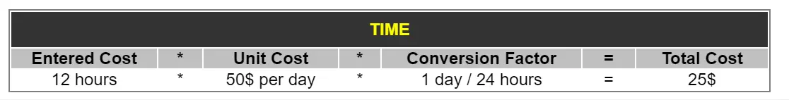 •Time: The total cost will be calculated by multiplying the operator's entered cost (e.g. 12 hours) by the "unit cost" (e.g. 20$ per day), and if required by a "conversion factor" (e.g. 1/24 for converting hours to days).
