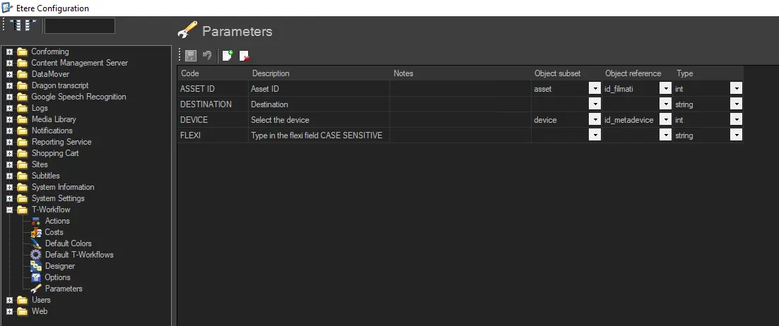 It was decided that the T-workflow parameters can be launched only from the Etere web, so these T-workflows do not appear in the list of available T-workflows inside the 'media library' or the search tab of Win applications.