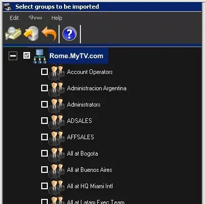 To retrieve groups, just scan the active directory. Forests and groups will be displayed in the bottom area, allowing you to select (tick off) the groups and then import them into the database: