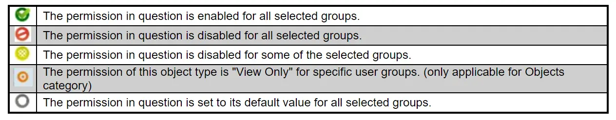 3. All Etere permission (e.g. access, base, objects, functions, etc.) will be displayed, indicating their current status through a set of icons: