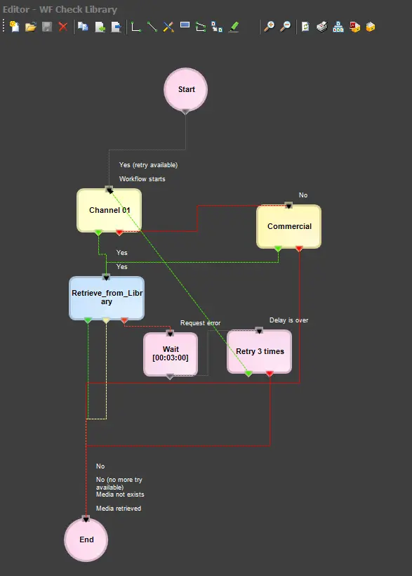 Actions created for retrieving media files from an external digital library are available under the actions list section; these actions can be used as illustrated in the following workflow (e.g. WF Check Library):