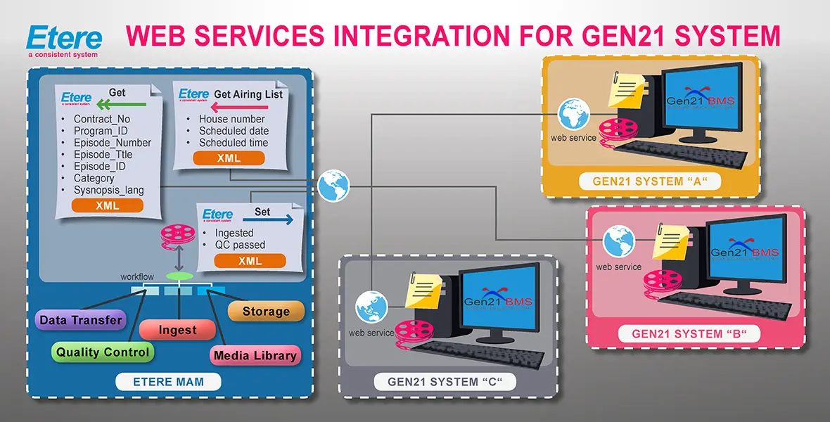 The Etere's capability to interface third-party systems has been extended to Gen21; the integration is based on the methods available in the web service provided by Gen21 for communicating with other solutions. Etere has implemented a series of T-workflow actions to interact with Gen21 to get and set asset data based on the methods supported by the Gen21 web services.