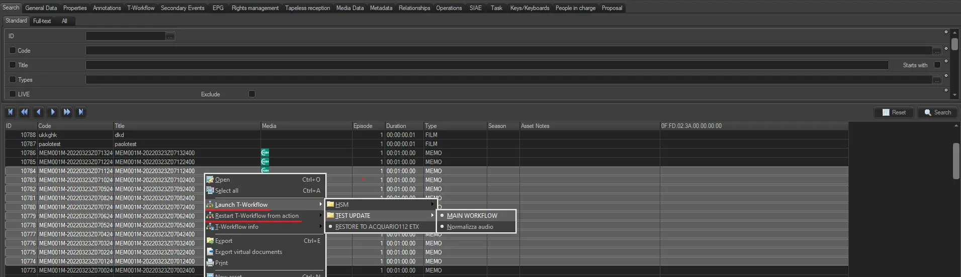 The Media Library allows you to manage multiple assets, editing them simultaneously. This is useful when you wish to associate various assets to a T-Workflow. In the 'Search' screen, once the search results are listed by selecting assets one after another, holding down the CTRL key, multiple assets can be chosen or selected as in the example, the 'select all' option if you want to select all the assets listed below, after then, you can choose between either launching a T-Workflow (the system will automatically attach and start the T-WF on the asset) or restart an already running or started one from a specific action within the T-Workflow.
