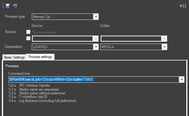 • Command line: Define the executable (and its parameters) for the cutting operation. Etere provides a default string that can be applied to configure the memory cut action: