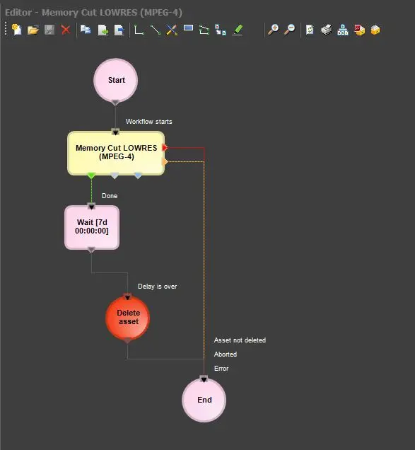Files created by cutting videos can be programmed to be automatically deleted after a certain time just by including into the T-workflow the action blocks: 'Wait [7 days]', 'File Delete ALL' and 'Delete Asset':