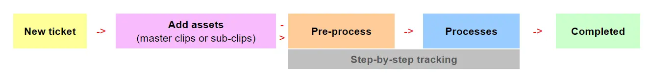 New ticket->Add assets(master clips or sub-clips)->Pre-process->Processes->Completed