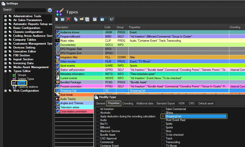 In "Etere Configuration > Settings > Types Editor > Types", create a new type (e.g. Shopping Cart), and enable the "shopping cart" property under the "Properties" tab: