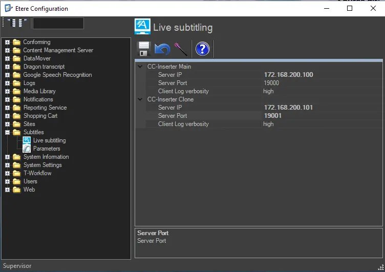 The Live Subtitling section lets you define the Main and Clone Closed Captions Servers used for Live Subtitling and set the verbosity logging level for the subtitling log to be captured in the log file in both servers.