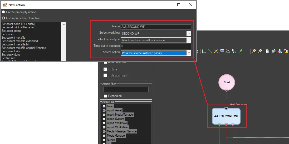 attach and start workflow instance - The selected T-workflow will be associated with the asset and launched; the action will return an output based on its result: attached / not attached / / / already started