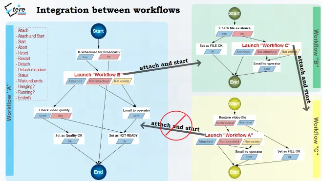 The diagram illustrates how Etere maintains the system consistency by avoiding loops between T-workflows (a message is displayed indicating the incompatibility between action and T-workflow)