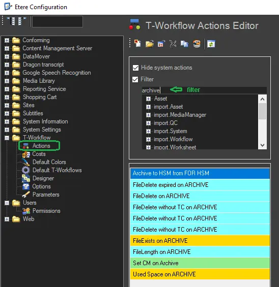 •Hide system actions: If checked, all system actions (i.e., actions created automatically by Etere) will not be shown on the list below,