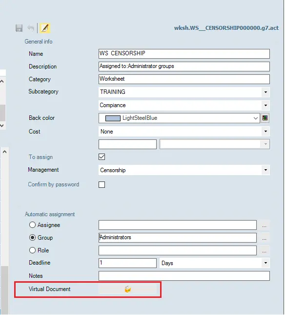 When creating a T-workflow action, you can attach a virtual document for users to download into the local workstation. In the T-workflow creation template, click the Virtual Document icon at the bottom to upload a virtual copy to the T-workflow.