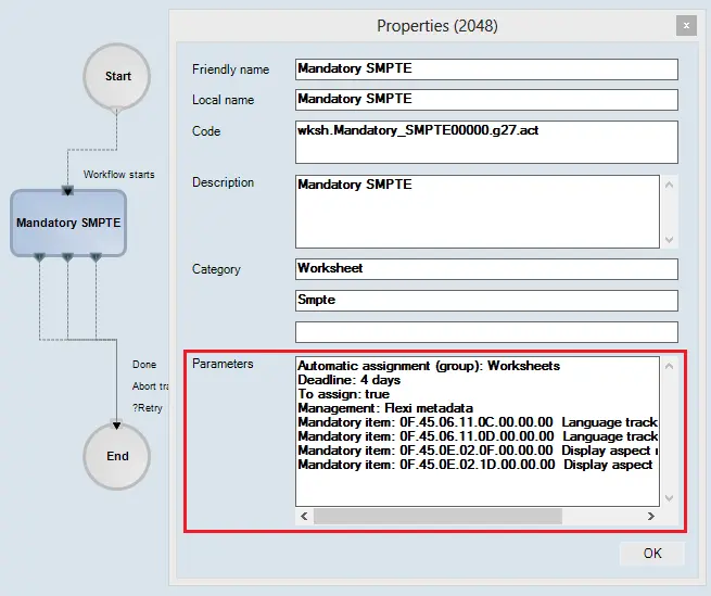 Parameters - The Parameter tab displays the properties of the T-workflow action, such as Device (e.g. HIRES), Codec (e.g. Seachange BMC), delete from the Device, set current metafile, HSM Archive, HSM Restore, HSM File Exist, HSM File Online, HSM File Delete, etc.