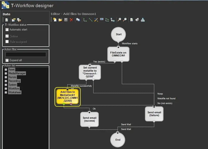 To bind files to video servers, for example, from the Media Library module, it is first required to include the "Add files to video server" action into a T-workflow using the T-Workflow Designer: