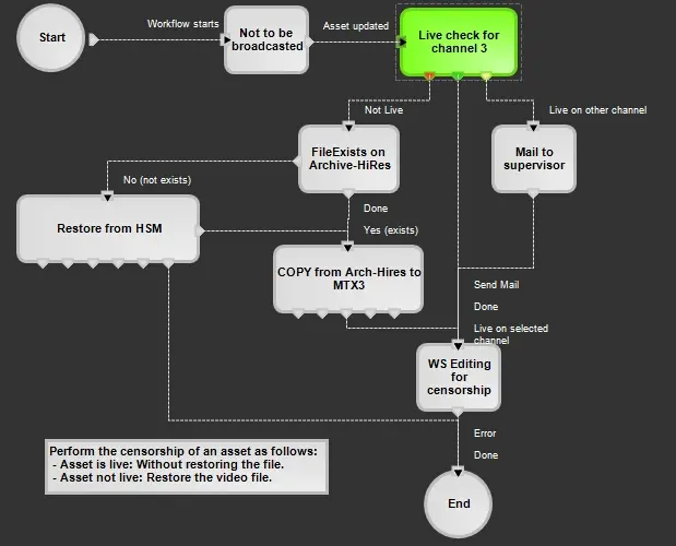 To check if an asset is either live or not, for example, to skip restoring files into a video server, it is first required to include the "Live Check" action into a T-workflow using the T-Workflow Designer:
