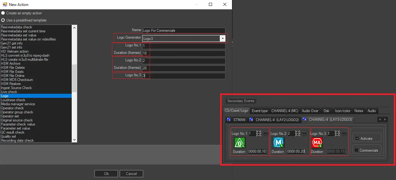 The Logo template allows the creation of an action that will permit the creation of an asset form, the logo(s) to be displayed during its on-air transmission.