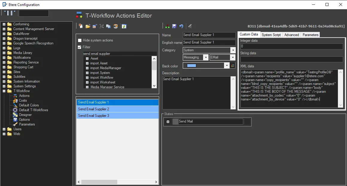 NB: This action is based on existing email profiles; if the profile doesn't exist in the MS SQL Server, the T-workflow action results in a fault.
