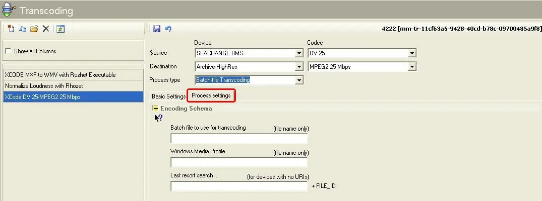 When defining a batch file transcoder action, the following information needs to be compiled under the 'Process settings' tab: