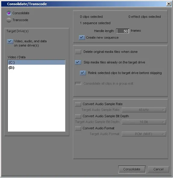 Consolidate - Enable this option to take all media used in a sequence plus handles and make new clips of only that length.