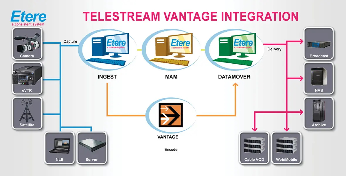 Etere can trigger Vantage transcoding T-workflows and get progress and status updates. Etere provides the capability of creating custom "Vantage integration" actions to request -via T-workflow.