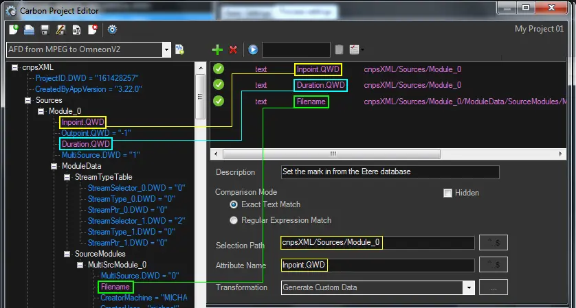 In the attributes tree, all the attributes matching a transformation rule will be highlighted: