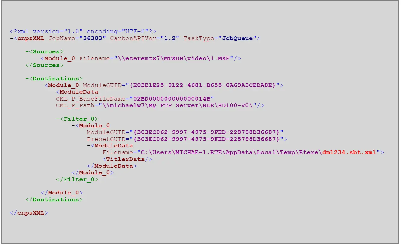 To allow ProMedia to complete the requested transcoding, Etere generates in the job output path a temporary XML file (e.g. dm1234.xml) mainly composed of the -<Sources> tag (file to be transcoded) and the -<Destination> tag (where and how to transcode the source file). Moreover, in case of subtitles are enabled, the -<Filter_0> tag will be added to hold the <TitleData> tag (i.e. how to get subtitles), and a second temporary XML file is created (e.g. dm1234.sbt.xml).