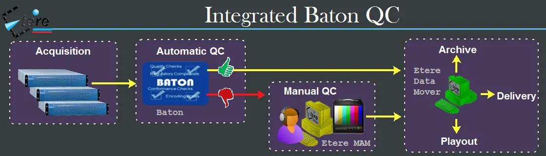 Etere provides the capability of creating custom "Baton integration" actions to request -via T-workflow- the execution of verification tasks based on Baton test plans for media files stored (or being streamed) on Etere metadevices: