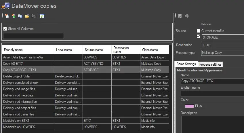 Bind to: Alternatively to a new action creation, this function makes a table appear listing various Copy actions used by Etere versions previous to 19 (e.g. ftp_cache to ftp_onair, ftp_onair to low_res, etc.).