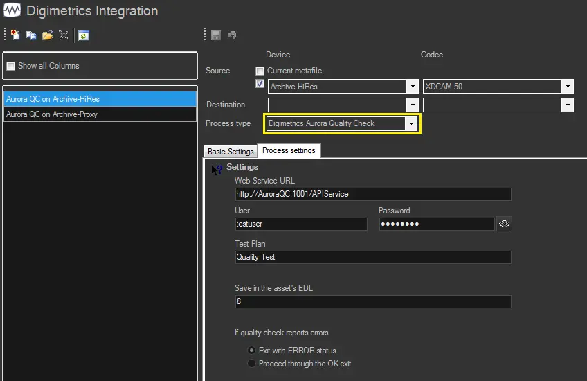 Process type: Indicates that the current action is a "Digimetrics Aurora Quality Check".