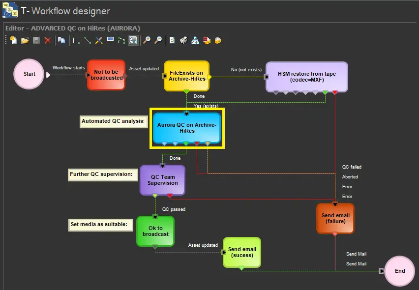 5. Use the T-Workflow Designer to include the action in a T-workflow (e.g. to verify the quality of media files through an Aurora system):