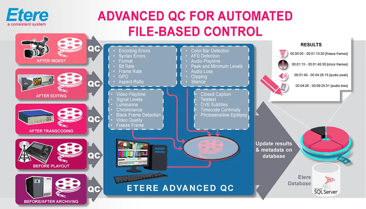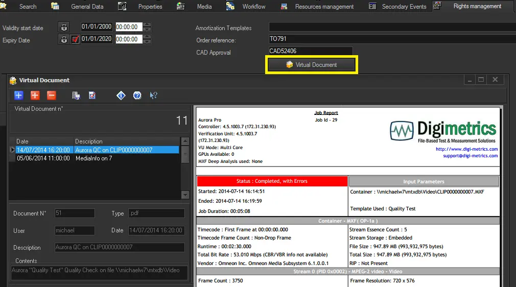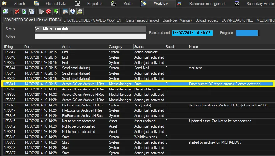 Etere provides the capability of creating custom "Aurora integration" actions to request -via T-workflow- the execution of verification tasks based on Aurora test plans for media files stored on Etere metadevices:
