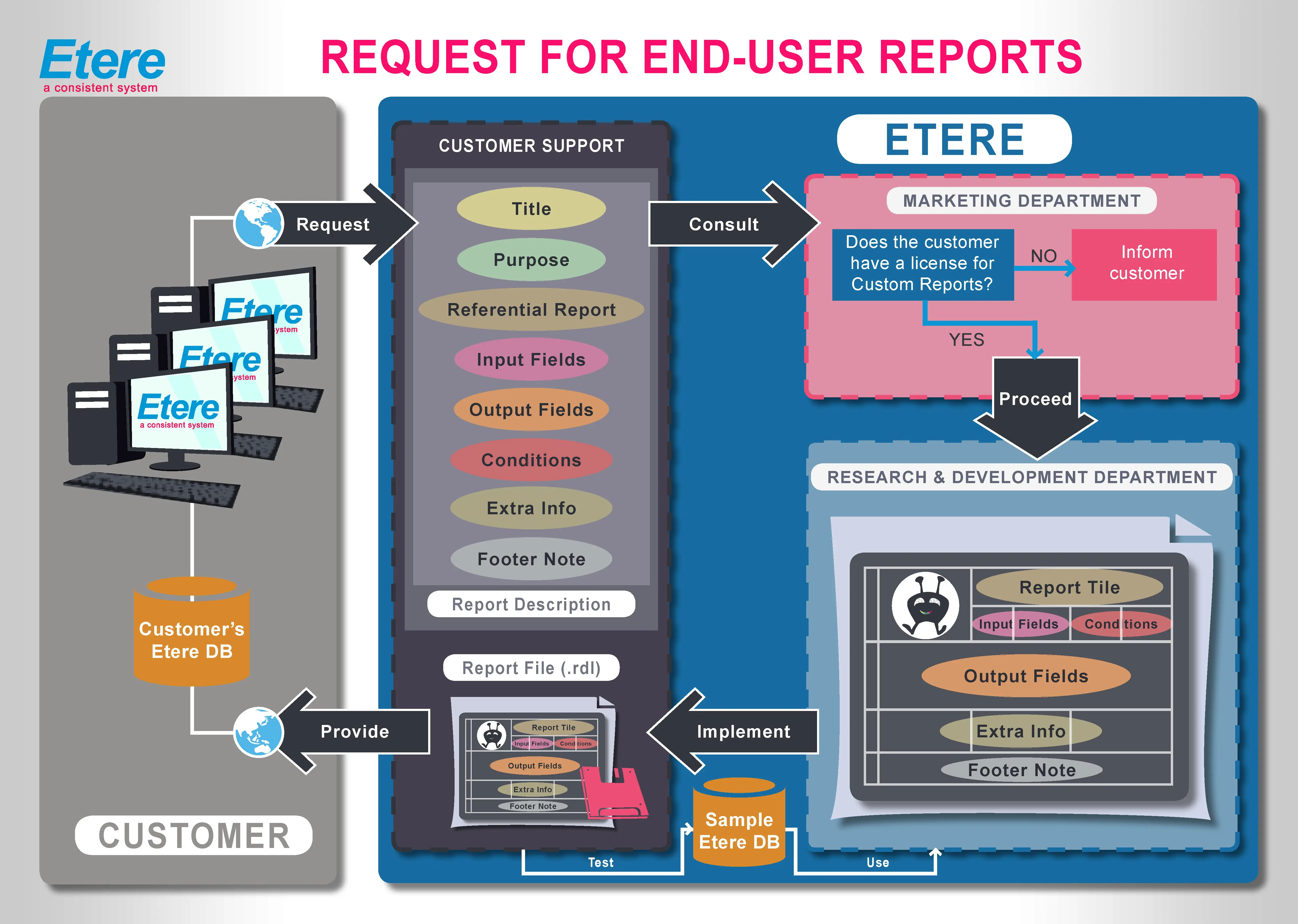 The procedure that a customer must follow to request a custom report is clearly explained in the following flowchart and the steps below: