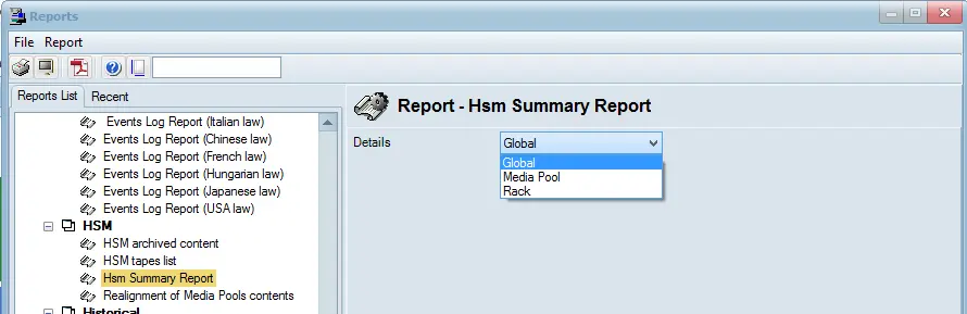 The HSM Summary Report contains information on tape media stored in HSM tape libraries, media pools or external racks. Data includes the total number of tapes in the library, media pools or rack, the amount of storage space used, and the total amount of files in the specific location.