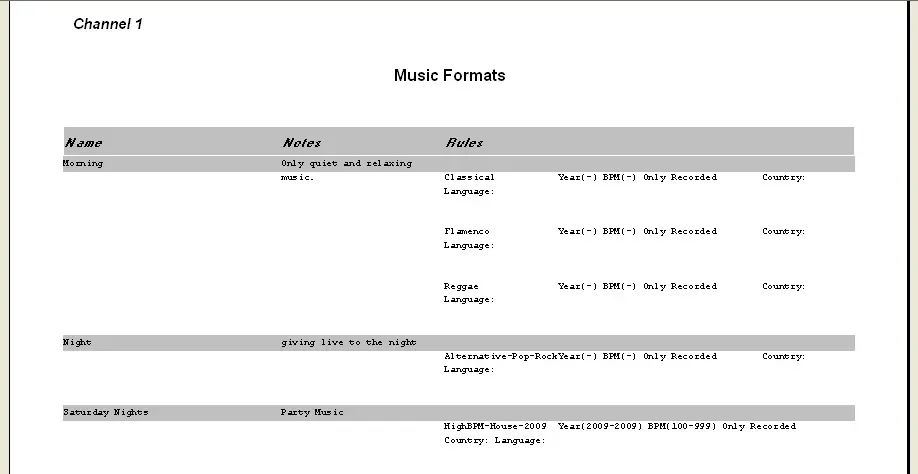 This report allows printing of music formats assigned to the schedule for those stations using the Airsales application.