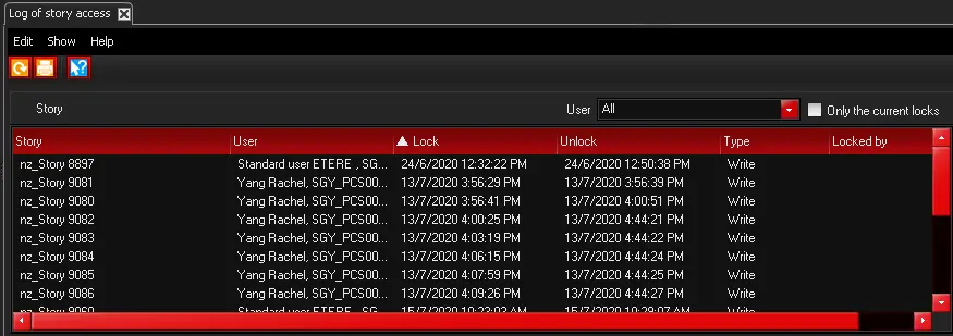 In the Stories node, you can use the Log of Story access sub-node to generate a report with the same name to determine and manage the stories locking status.