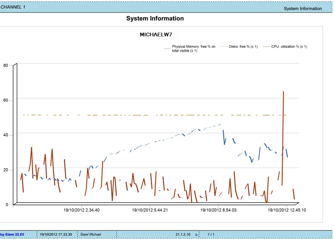 The System Information report generates a document containing the management information of all Etere PCs collected by the Monitoring Console's System Information service. The provided information here will include gathered WMI data such as CPU utilization, DISK-free space, and unused MEMORY.