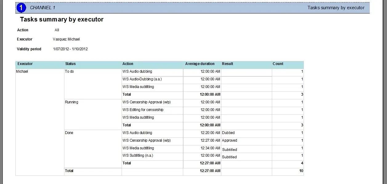 The Task Status by Executor report allows for generating a document containing detailed information (actions, status, durations, results, etc) on the selected worksheet executors.