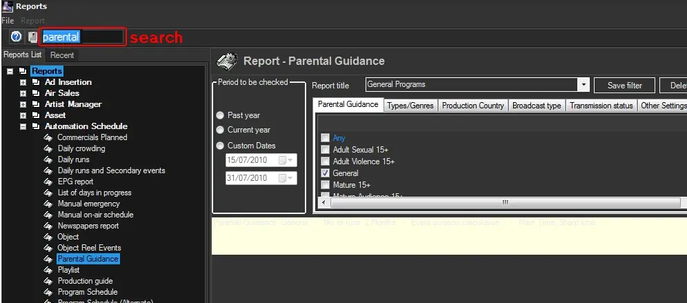 Searching for any report by its name is possible by entering its name (or a part of it) in the search box located in the top left of the reports window:Searching_Reports