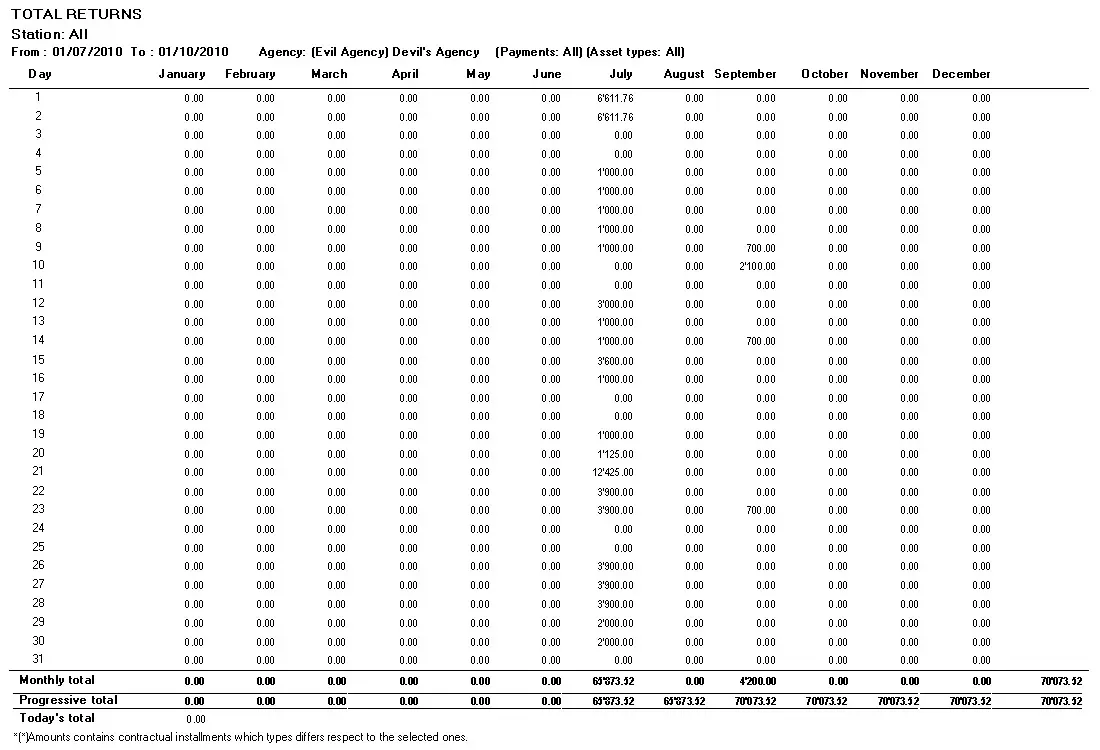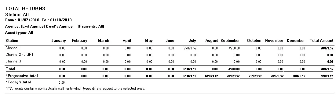 - Monthly global report by one or more stations: A table containing the monthly revenues derived from each selected station during a specified date range,