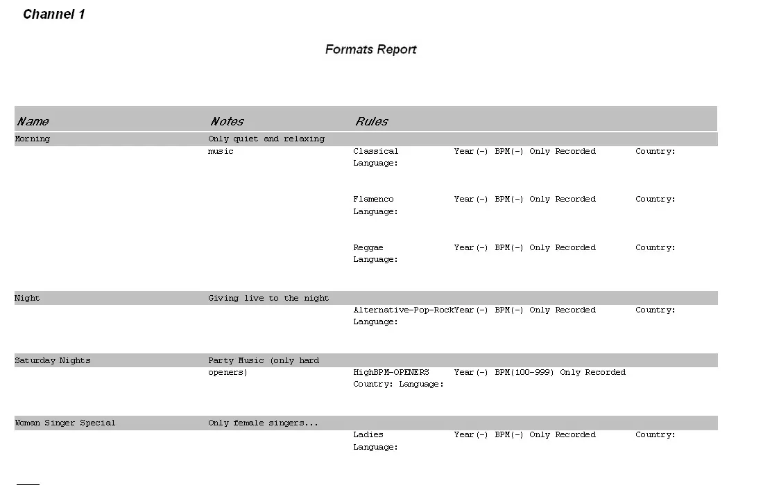 The Format report allows the generation of a document containing all the formats existing in the station; the report will detail the notes and rules that define each format.