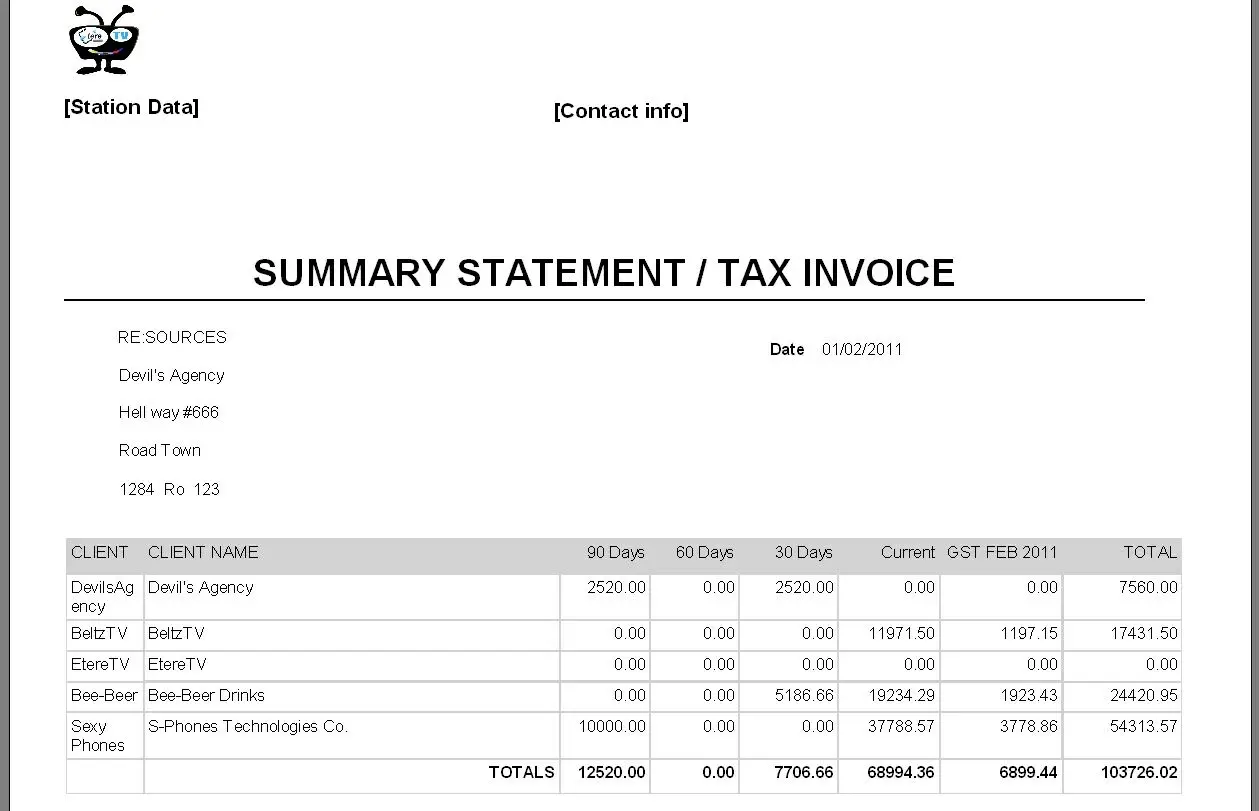 The Summary Statement / Tax Invoice report allows to generate a document containing all outstanding invoices (related to the customers of a specific agency) divided into four monthly periods: 0-30 days (current), 30-60 days, 60-90 days and over 90 days. This report includes the current month's VAT and the total amount, which is the sum of all monthly amounts plus the month's VAT.
